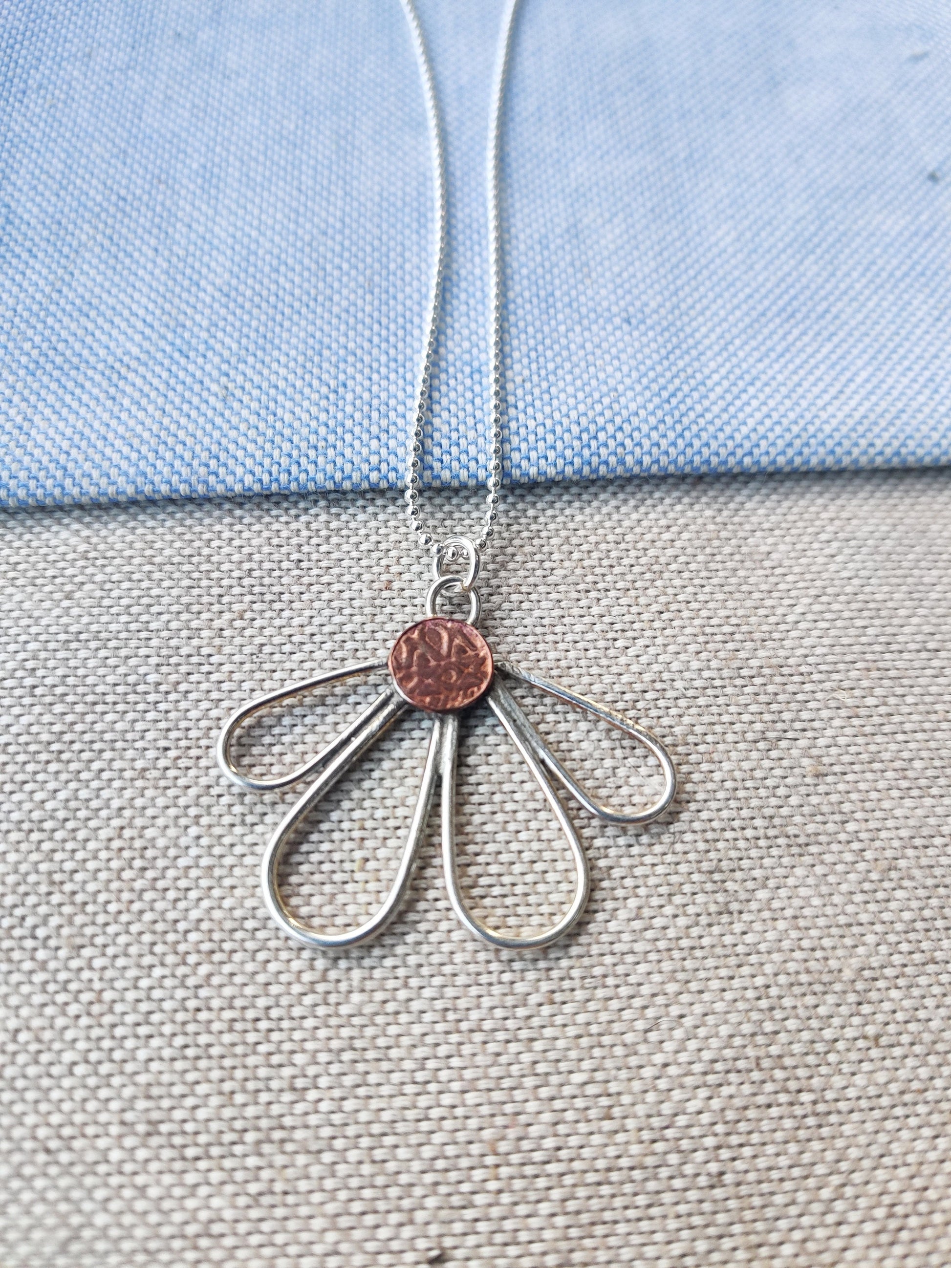 A unique daisy pendant crafted from sterling silver and copper. The pendant measures 1.5" at it's widest point and 1" in length. The silver chain is a fine ball style chain 20".