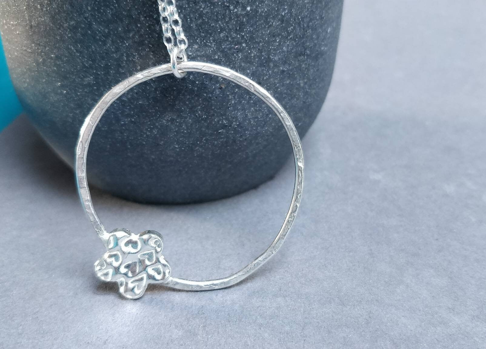 A unique necklace pendant made from sterling silver. The circular pendant has a fine silver flower pendant and finished with a sterling silver chain. The measurement of the pendant necklace is 1.5" across and the chain measures 20 inches.