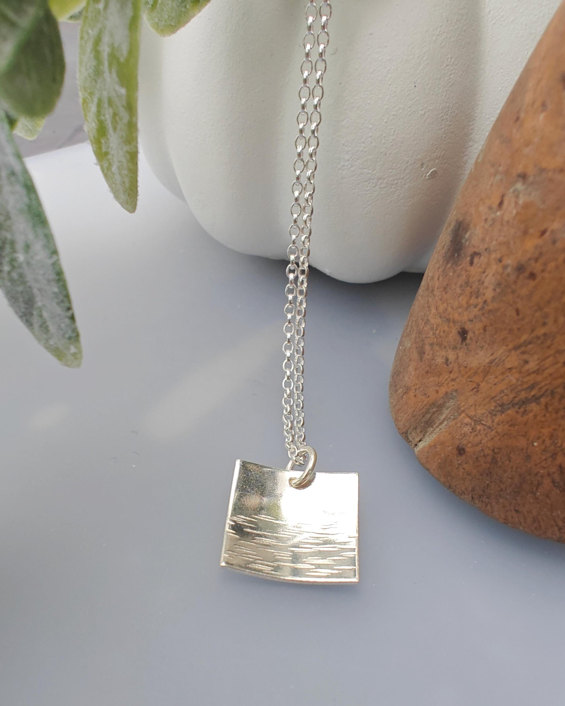 Ocean view pendant crafted from recycled sterling silver with a delicate sea design etched onto the silver. The pendant measures 2 cm square. The silver chain is a fine belcher style chain 20".