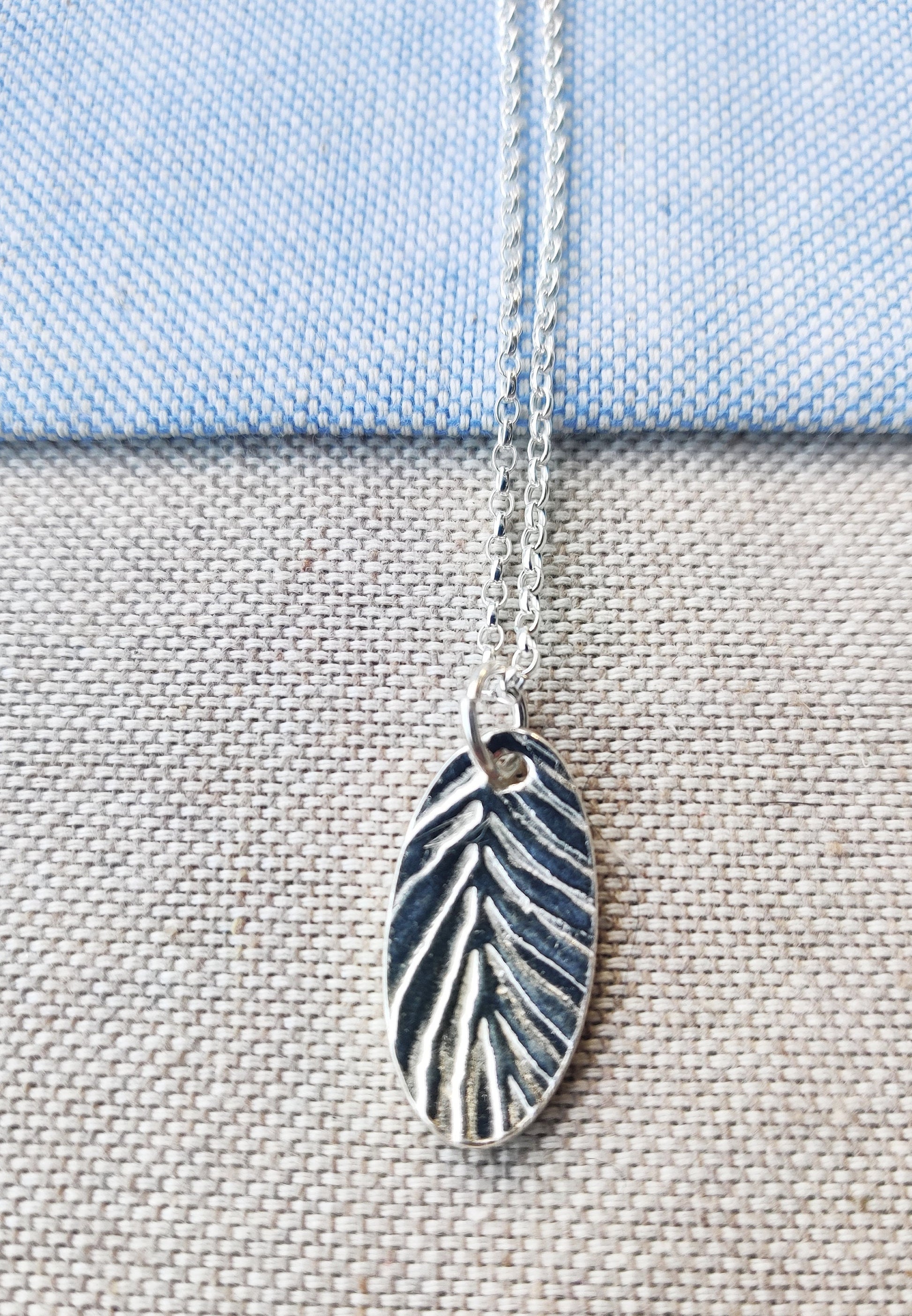 Made from fine silver with a sterling silver 20" chain. A one off silver leafy print pendant.