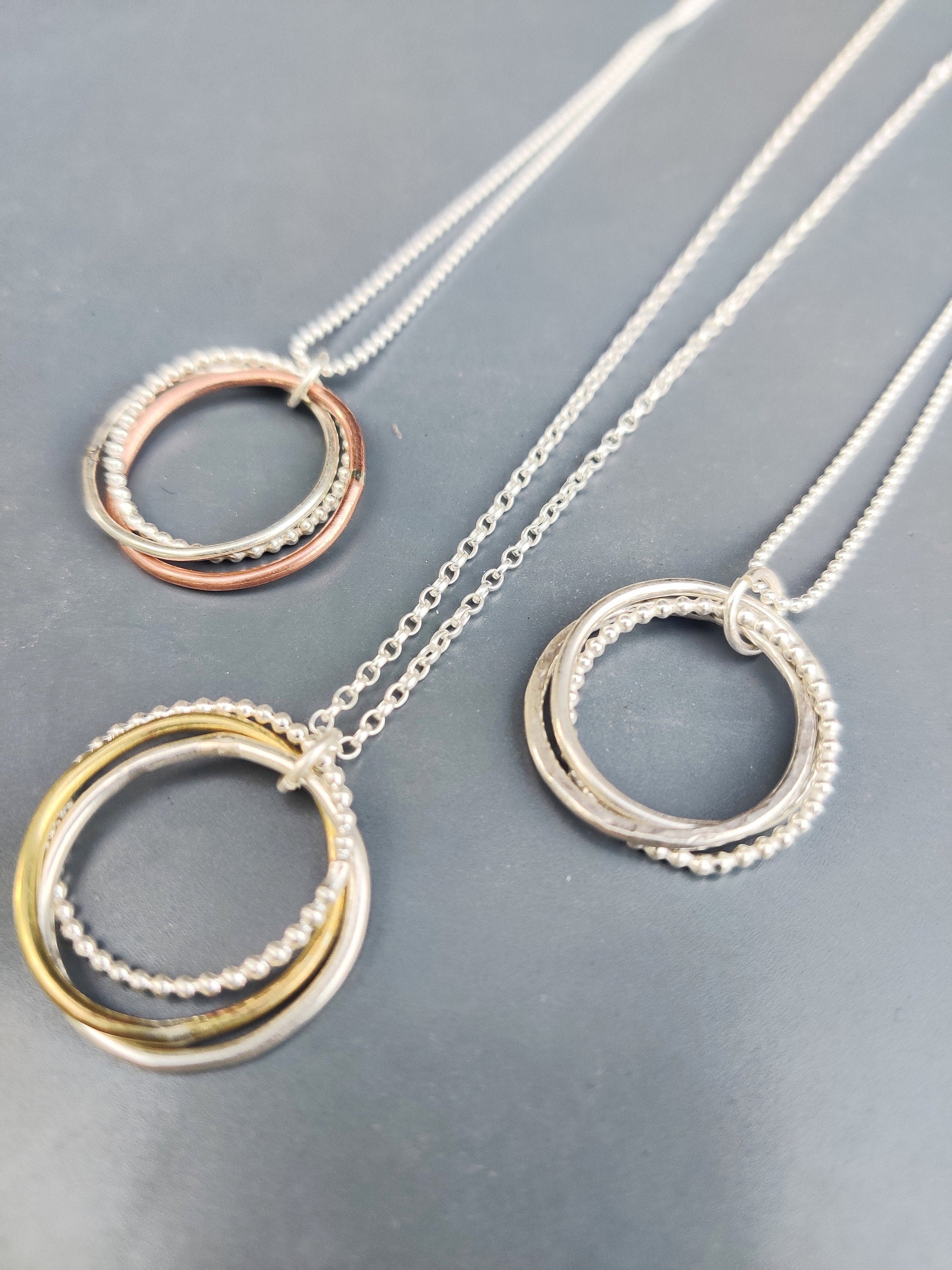 Hand cut, shaped and soldered silver finished with a 20" silver beaded style chain. Each hoop is different, plain, hammered and a beaded wire one. soldered into an intertwined pendant.