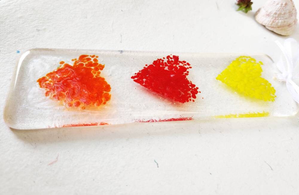 Clear glass that has been fused and then decorated with coloured glass in heart pattern and the fused again. The hearts are slightly textured.